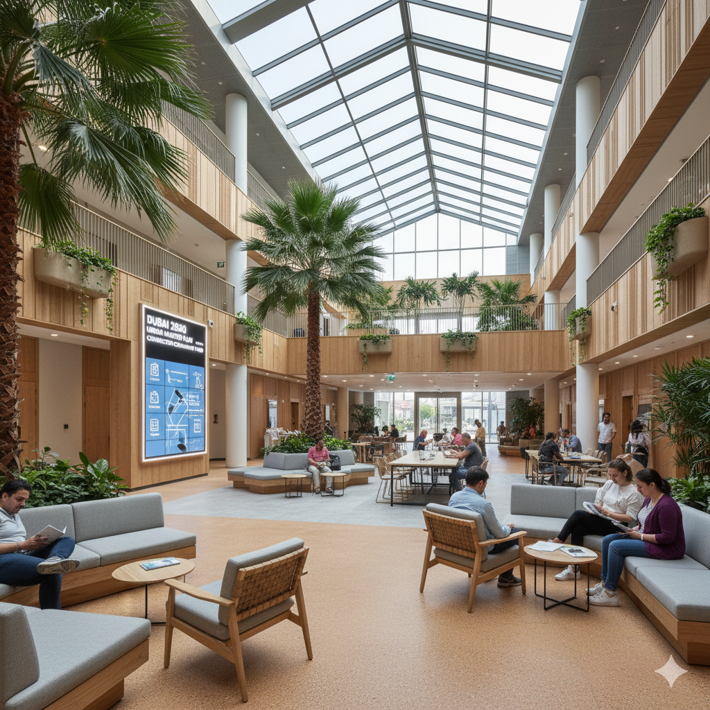 Community focus. The Dubai 2040 Urban Master Plan keeps briefs anchored to 20-minute neighborhoods and human-scaled public interiors.